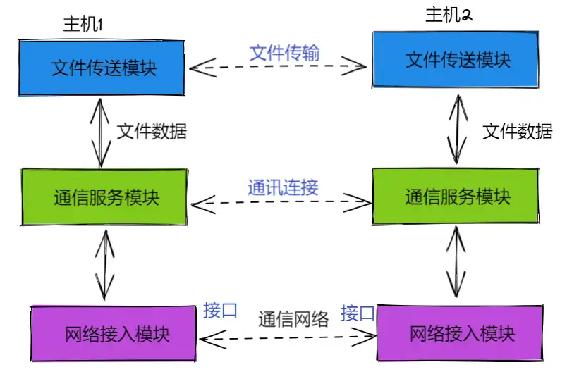 发送方:文件传输模块将文件或命令给到通信服务模块,通信服务模块再通过接入模块发送。