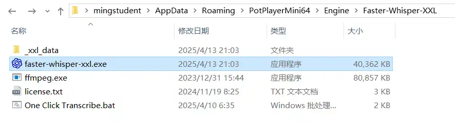 Faster-Whisper(下载路径设置为Engine),文件大小:1.39G。下载完成后解压缩到当前目录。把和exe同级路径下的所有文件拷贝到Engine/Faster-Whisper-XXL