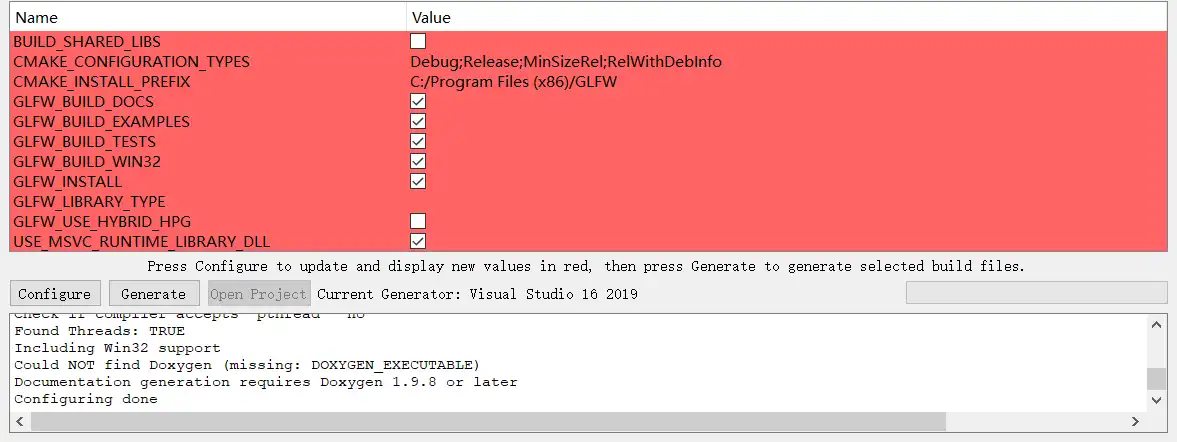 - 生成动态库:打开解决方案sln,运行。编译成功后在src/Debug 下生成glfw3.dll
