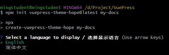 npm init vuepress-theme-hope@latest my-docsmy-docs是项目文件夹,需要为空。如果没有会自动创建。
