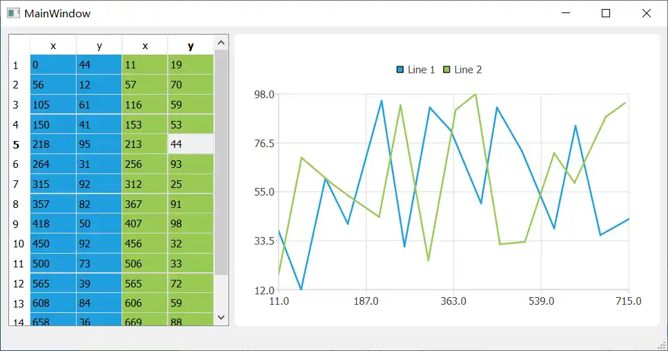 虽然修改表格中的坐标值点可以更新位置,但是如果点的坐标值超出了原来的坐标轴范围,坐标轴不会更新。如上图中点(0,44)就没有显示在chartview范围内
